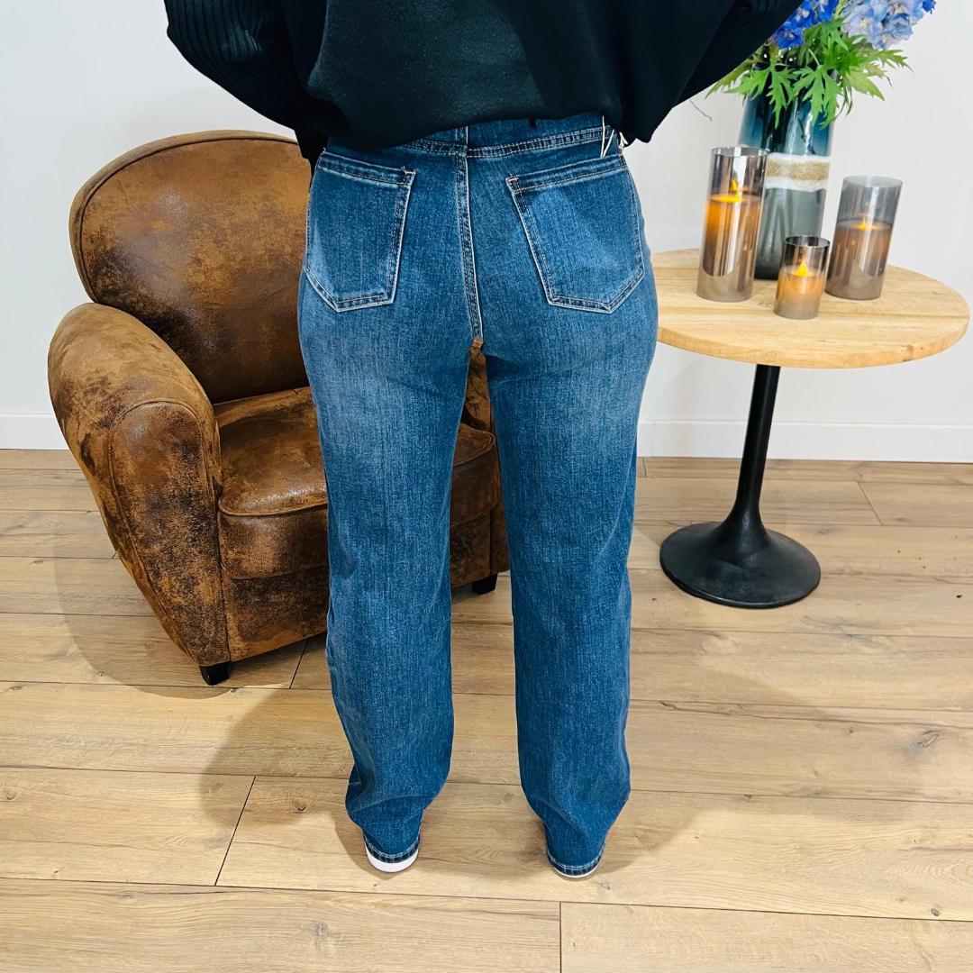 Sa toile denim légèrement stretch épouse la silhouette sans la comprimer, tandis que sa coupe droite allonge la jambe pour une allure élégante et décontractée à la fois.